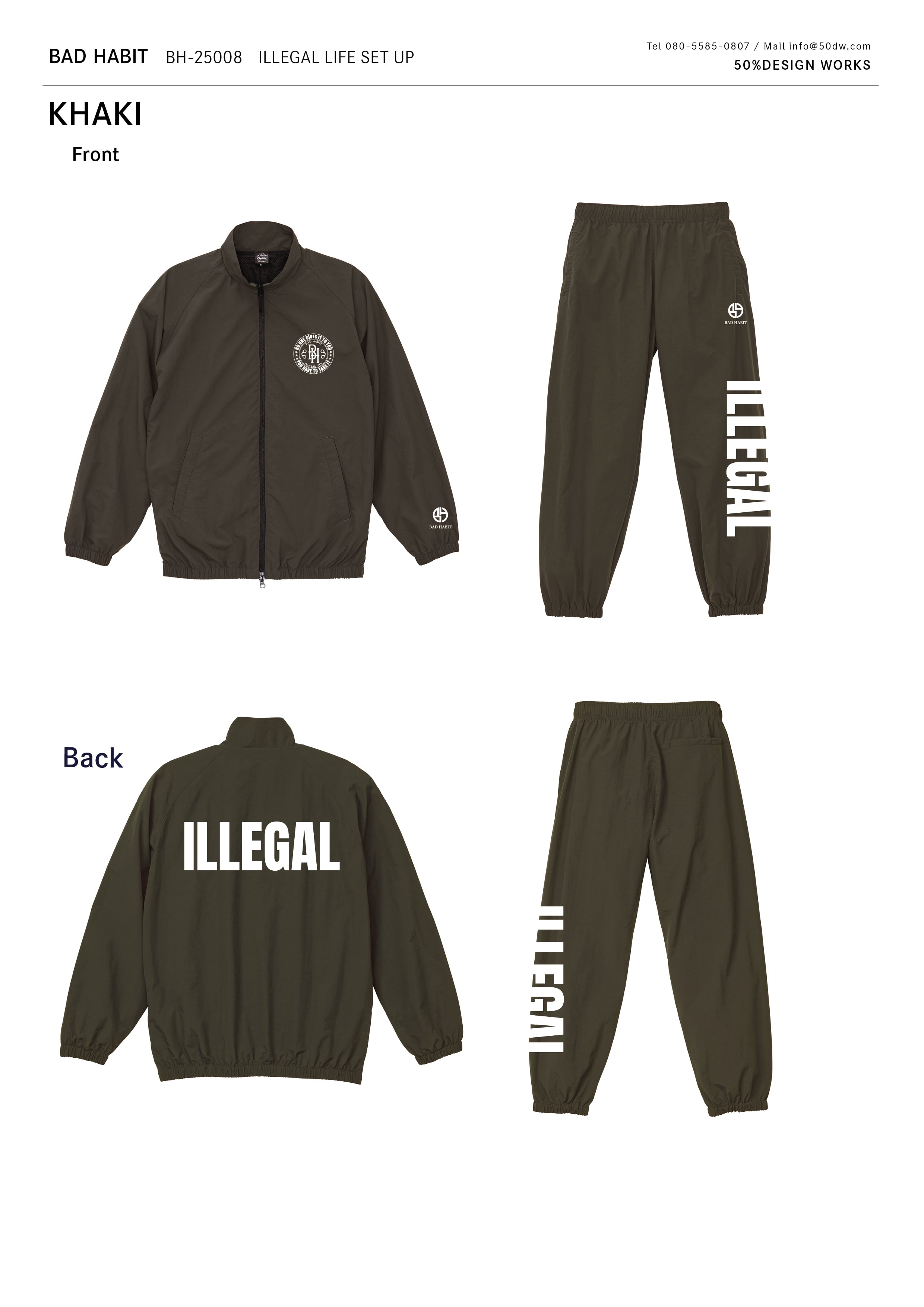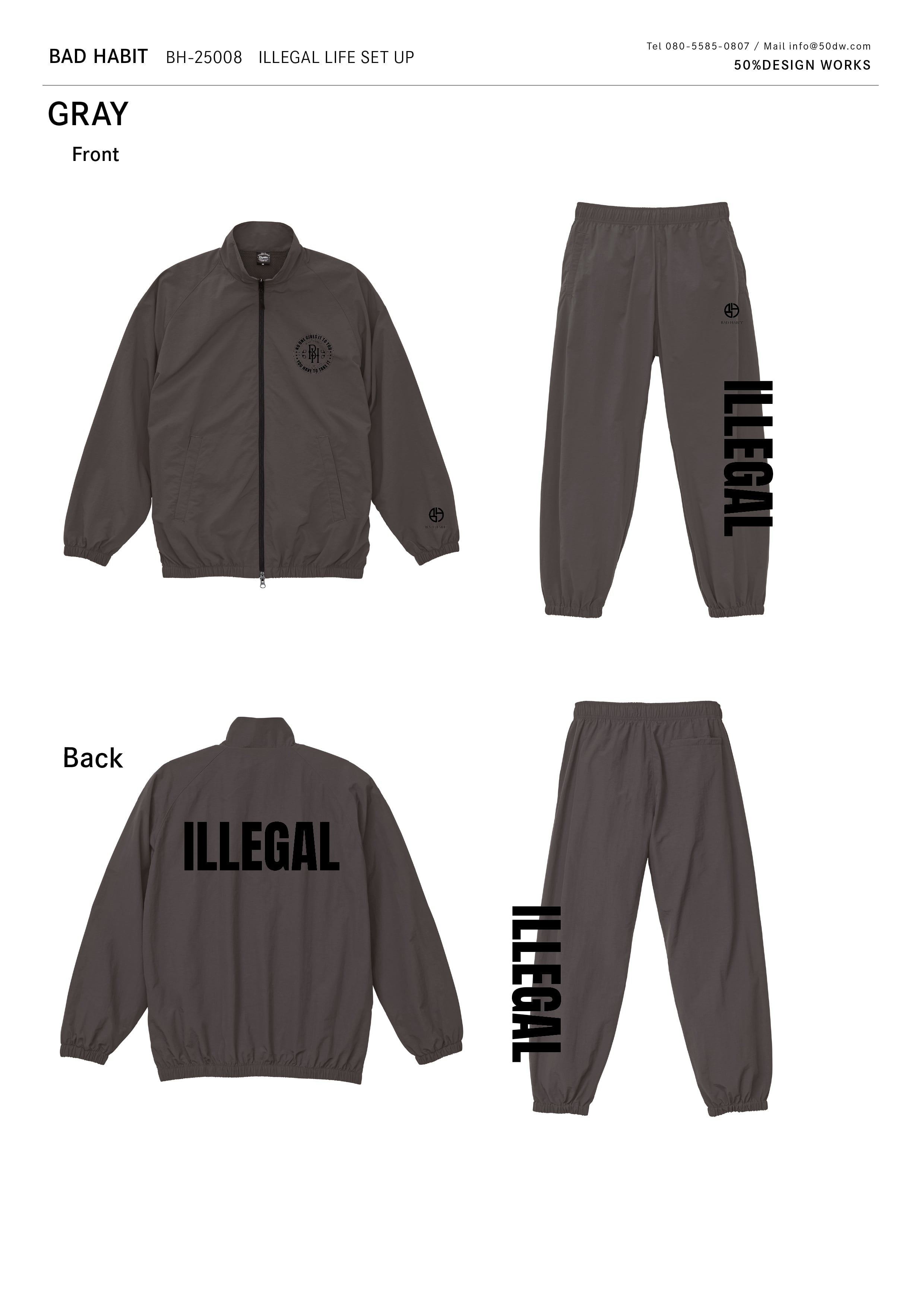 【BUY ORDER SPECIAL PRICE】 左足に「ILLEGAL」とプリントされたパンツ。 別売りトラックジャケットとのセットアップとなります。 胸・背中/プリント 袖/刺繍 Nylon 100%